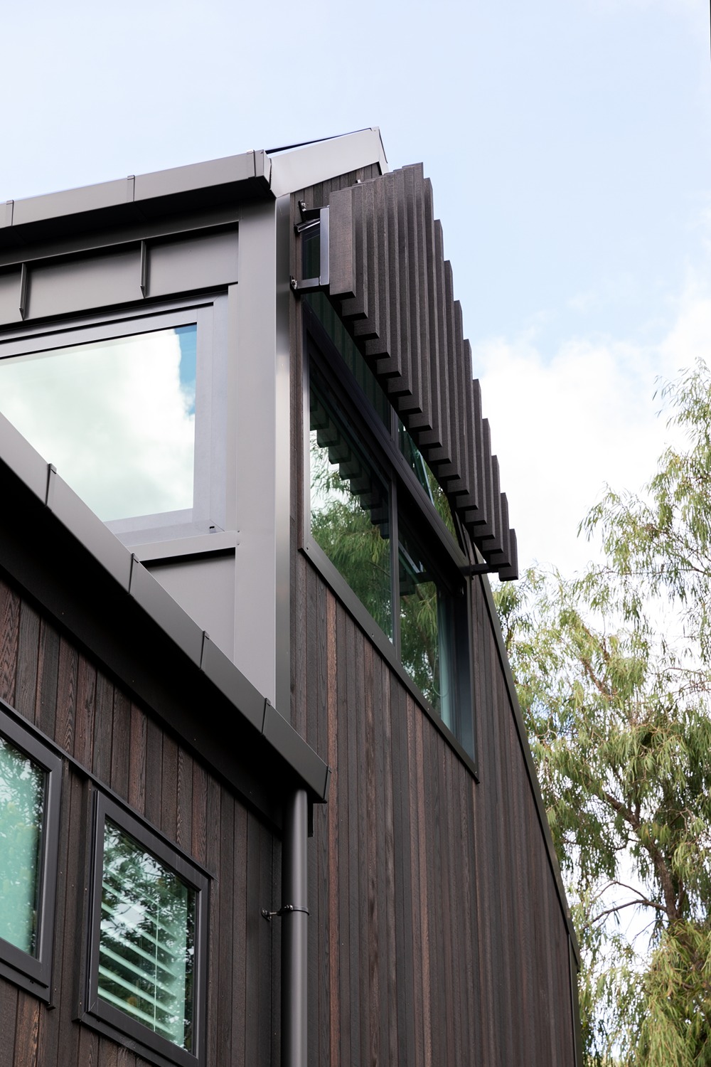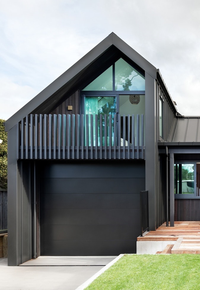 Nestled down a long drive and tucked into a sunlit corner, sits this compact coastal hideaway. Vertical, dark cedar cladding and a prominent asymmetrical tray roof provide a striking first impression and foreshadow the strong focus on line and shape that continues throughout the house.