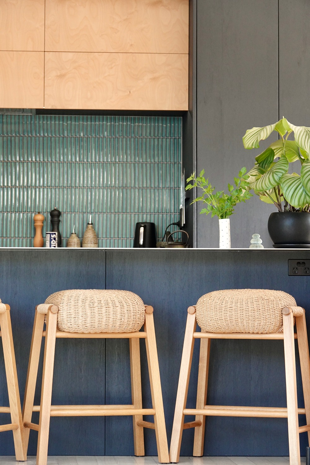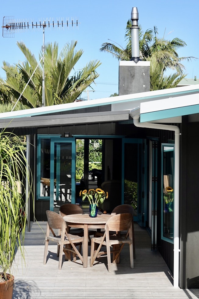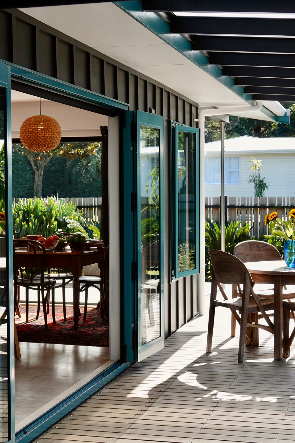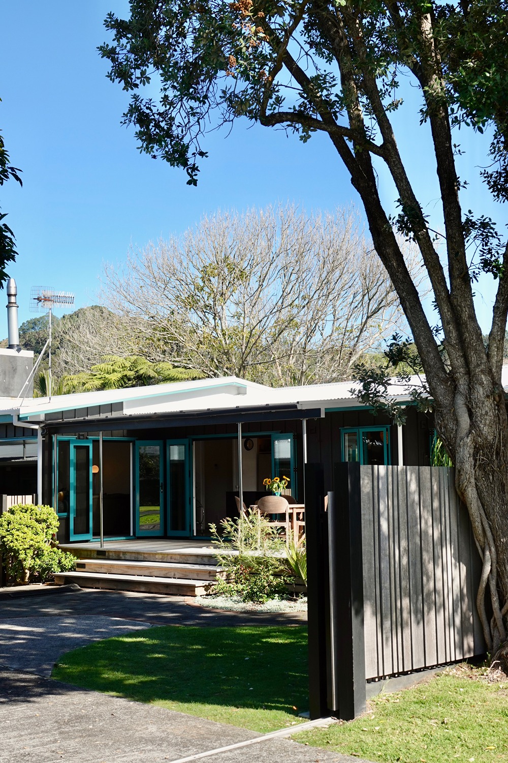 Retro teal joinery pops against the dark exterior cladding & garden greenery.